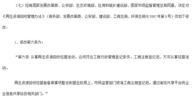 12月14日,商務(wù)部發(fā)布2019年第1號(hào)令,公布關(guān)于廢止和修改部分規(guī)章的決定,對(duì)相關(guān)多項(xiàng)規(guī)章進(jìn)行了清理,其中涉及到再生資源回收經(jīng)營,幫主現(xiàn)就具體新規(guī)逐條釋義: