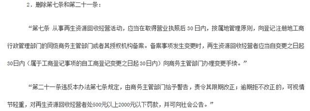 釋義:自2019年11月30日起,從事再生資源廢品回收經(jīng)營者,取得營業(yè)執(zhí)照后,無論經(jīng)營事項(xiàng)發(fā)生變化與否,都無需再向當(dāng)?shù)厣虅?wù)主管部門辦理備案或備案變更手續(xù)。自2019年11月30日起,再生資源行業(yè)主管部門(目前國家層面法規(guī)規(guī)定為商務(wù)部,有些地方城市指定為當(dāng)?shù)毓╀N社)對(duì)從事再生資源廢品回收經(jīng)營者,再不能借口沒有辦理經(jīng)營備案證進(jìn)行500元以上2000元以下罰款。